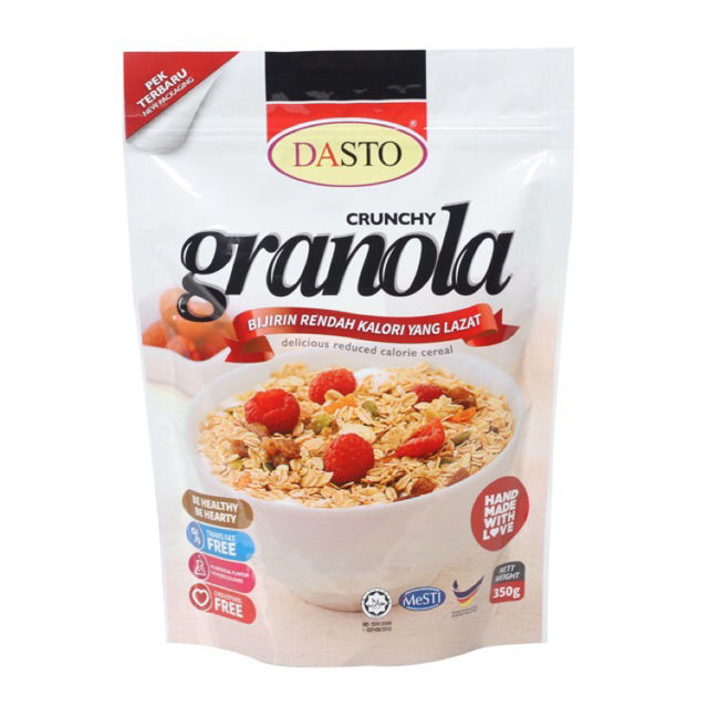 Granola berasal dari bahan yang sama dengan muesli, iaitu rolled oat, biji-bijian, kacang, dan juga buah kering. Bezanya, bahan-bahan itu semua dipanggang hingga menjadi sebati.